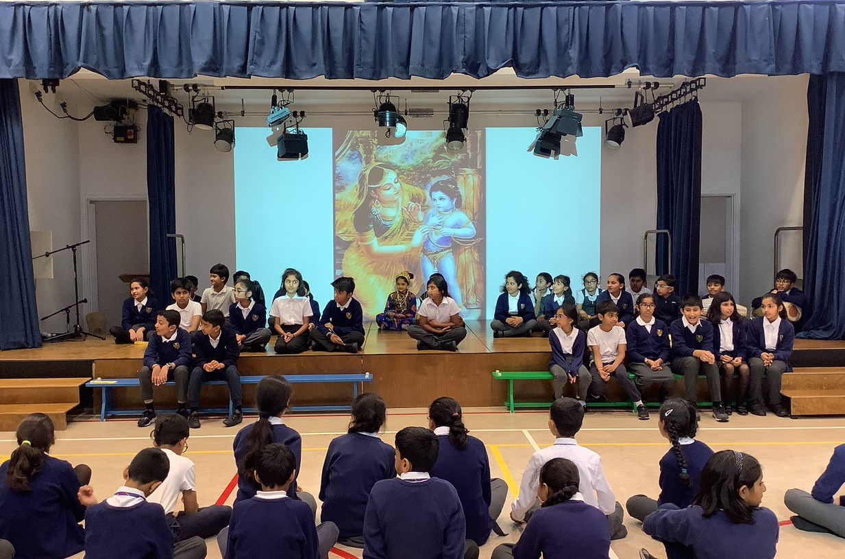 In KS2 children build on their earlier learning and progress further with key spiritual texts such as the Ramayana, Mahabharata, The Bhagavad Gita, Nectar of Instruction and more Vedic texts. Our curriculum underpins key themes such as, God & The Self, God & the World and The Self & The World. Children are taught how to think deeper, meditate, ask philosophical questions and communicate with the divine. This is done through a range of lessons and units of work which encompass drama, debate, meditation, writing activities including prayers, self-reflection tasks, reciting Bhagavad Gita quotes and understanding their meaning as well as opportunities to collaborate as a team.